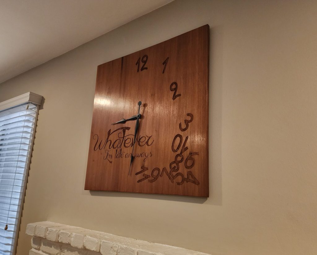 Whatever Clock “I’m Late Anyway” clock, a unique and funny addition to any room! Made from durable pine wood, this clock is not only functional, but also serves as a playful reminder to not take life too seriously. The laser engraved whimsical design features a clock face with a cartoon character that appears to be…