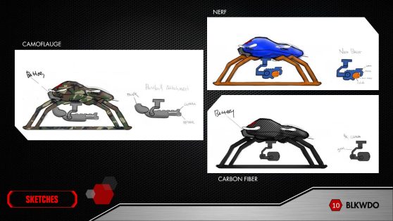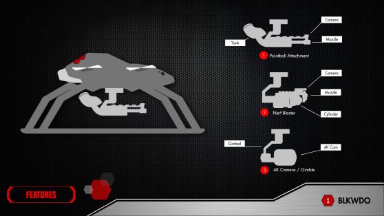 BLKWDO is a tactical drone concept which features 4 swappable attachments which snaps onto the drone. Made of premium quality components including carbon fiber, aircraft grade aluminum and durable ABS plastic. The BLKWDO is also available in several color options to fit your lifestyle!