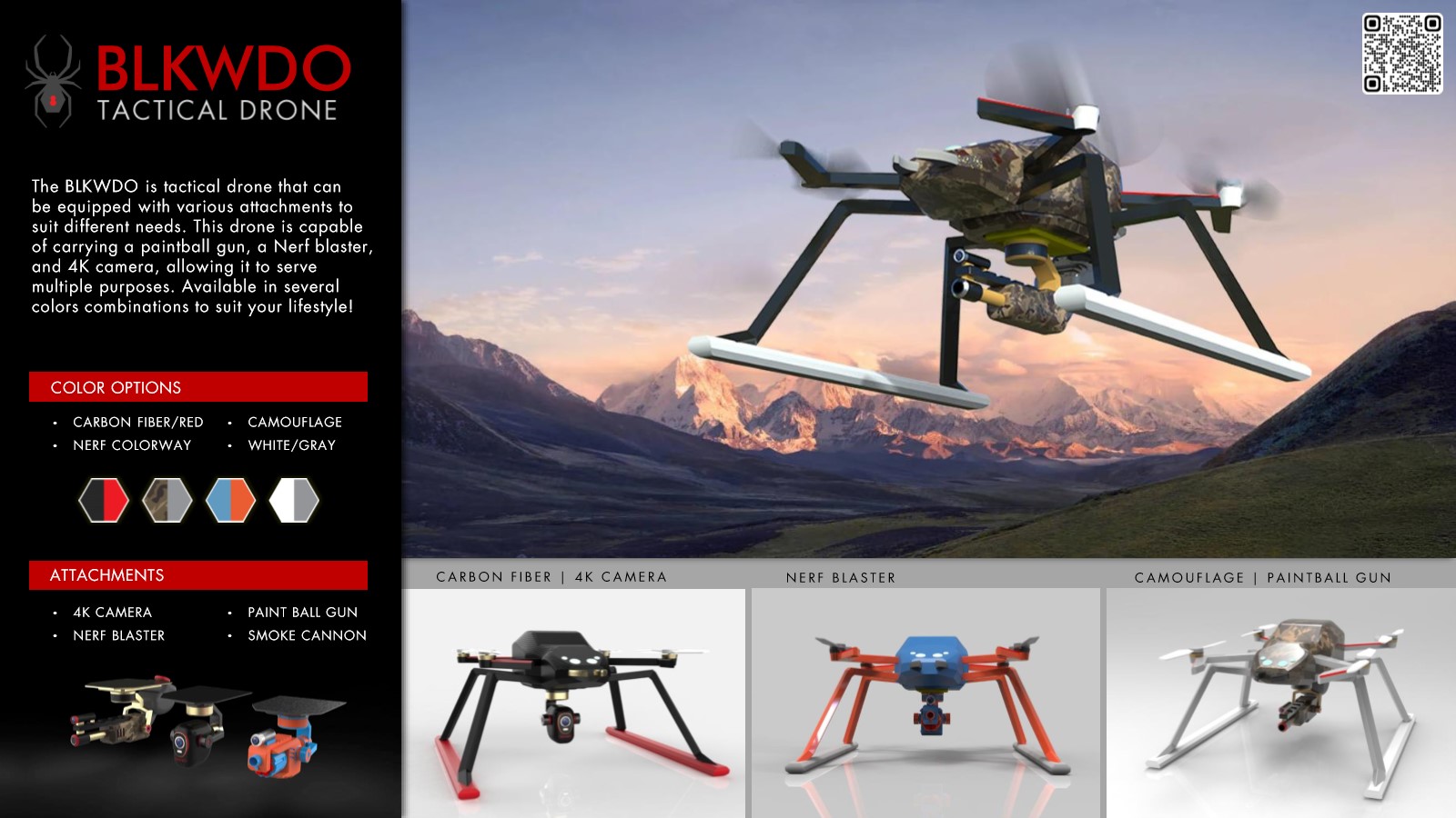 BLKWDO is a tactical drone concept which features 4 swappable attachments which snaps onto the drone. Made of premium quality components including carbon fiber, aircraft grade aluminum and durable ABS plastic. The BLKWDO is also available in several color options to fit your lifestyle!