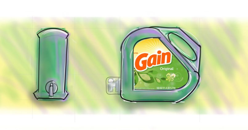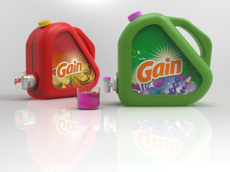 Our new Gain detergent bottle design with a built-in dispenser. This innovative design makes doing laundry easier and more efficient than ever before. The dispenser is integrated into the bottle, allowing for precise and measured dispensing of detergent, eliminating the need for measuring cups and reducing the chance of overuse. The bottle is also made with durable materials, ensuring that it can withstand frequent use and last for a long time.